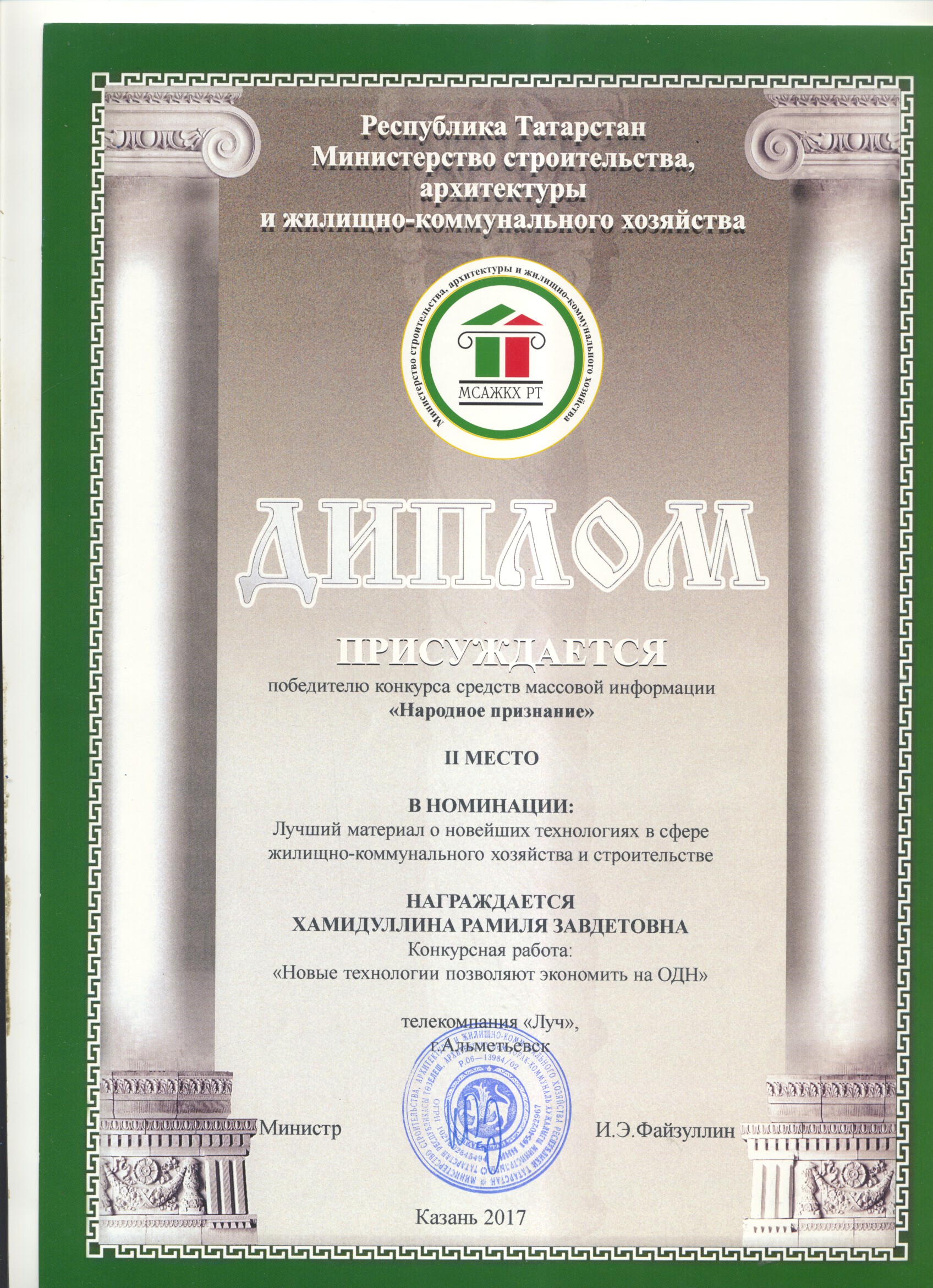 II место конкурса средств массовой информации «Народное признание» в номинации: «Лучший материал о новейших технологиях в сфере ЖКХ и строительства» (2017)