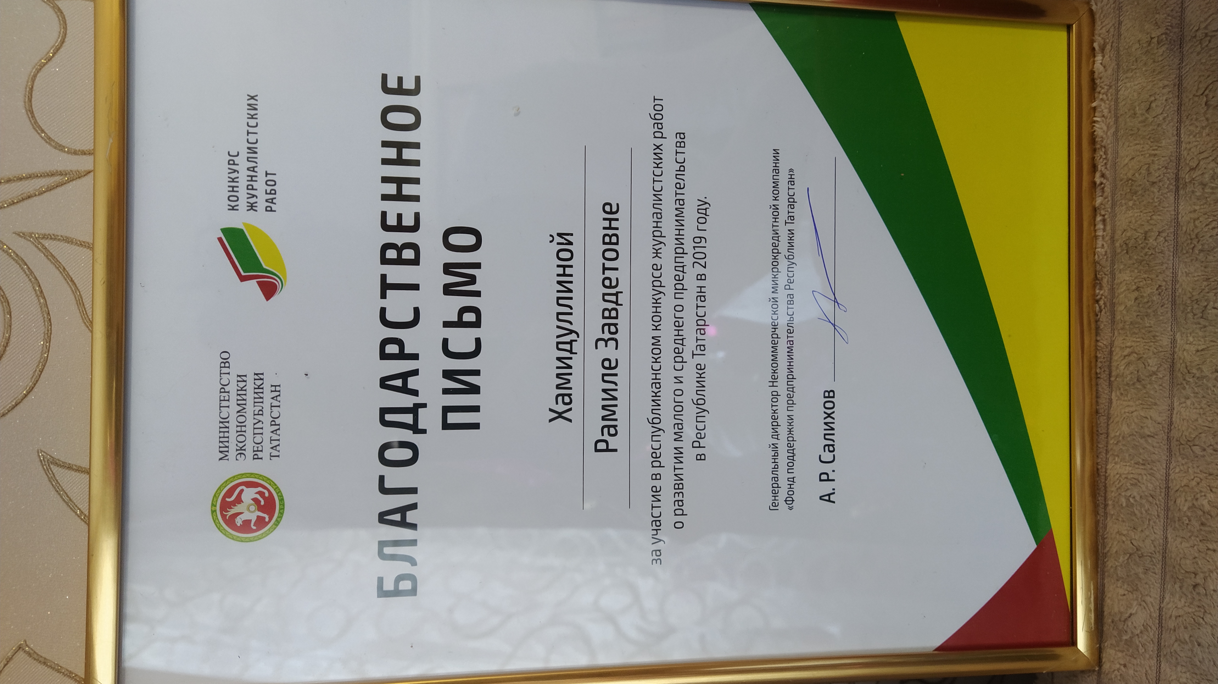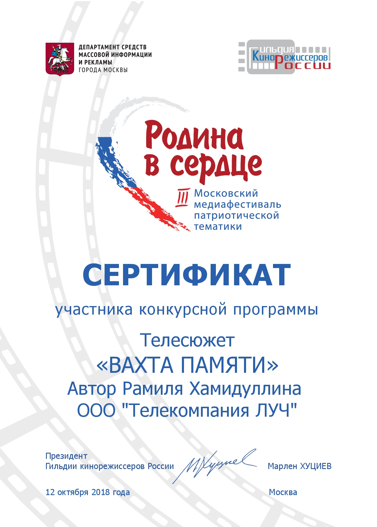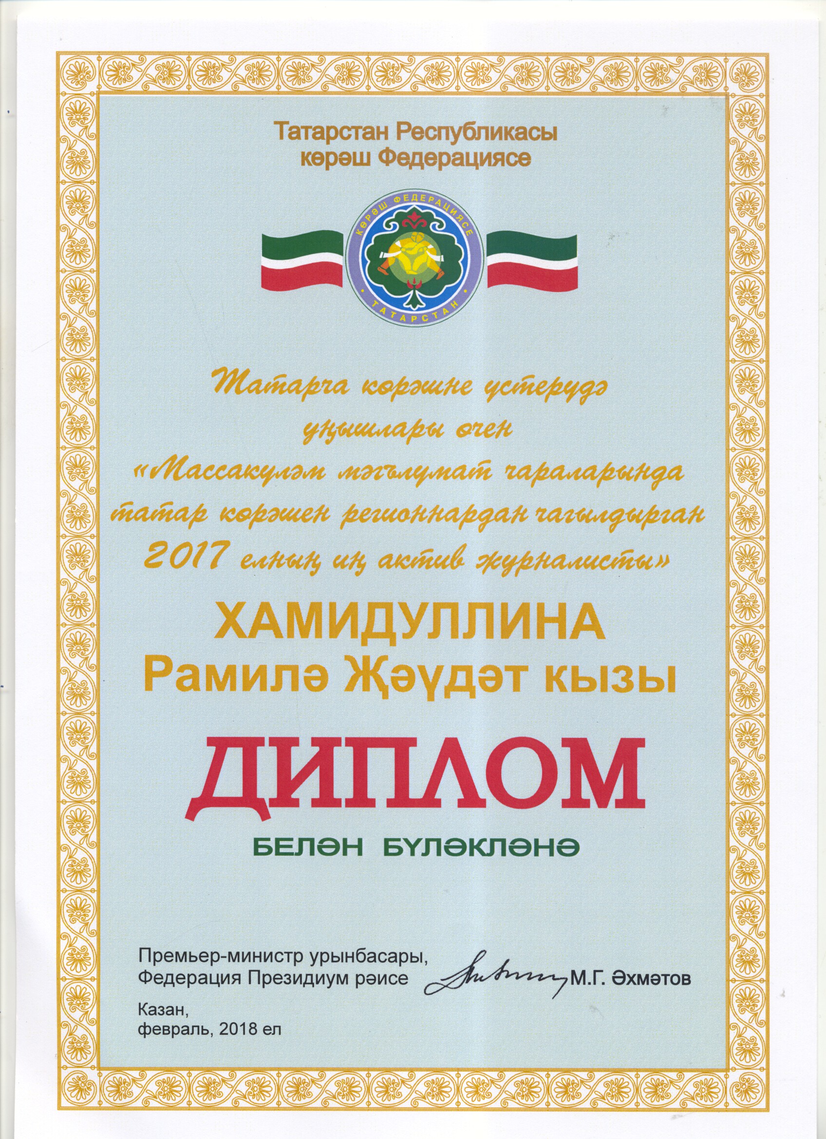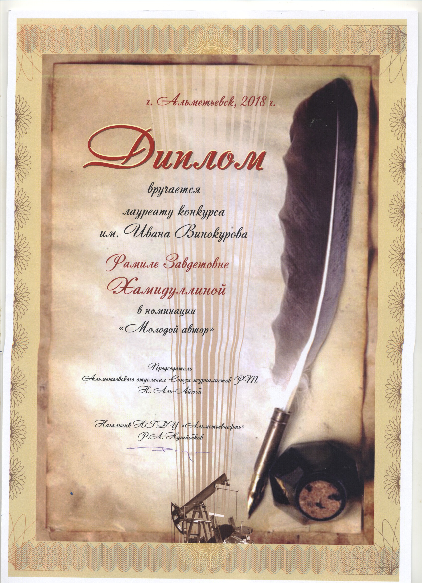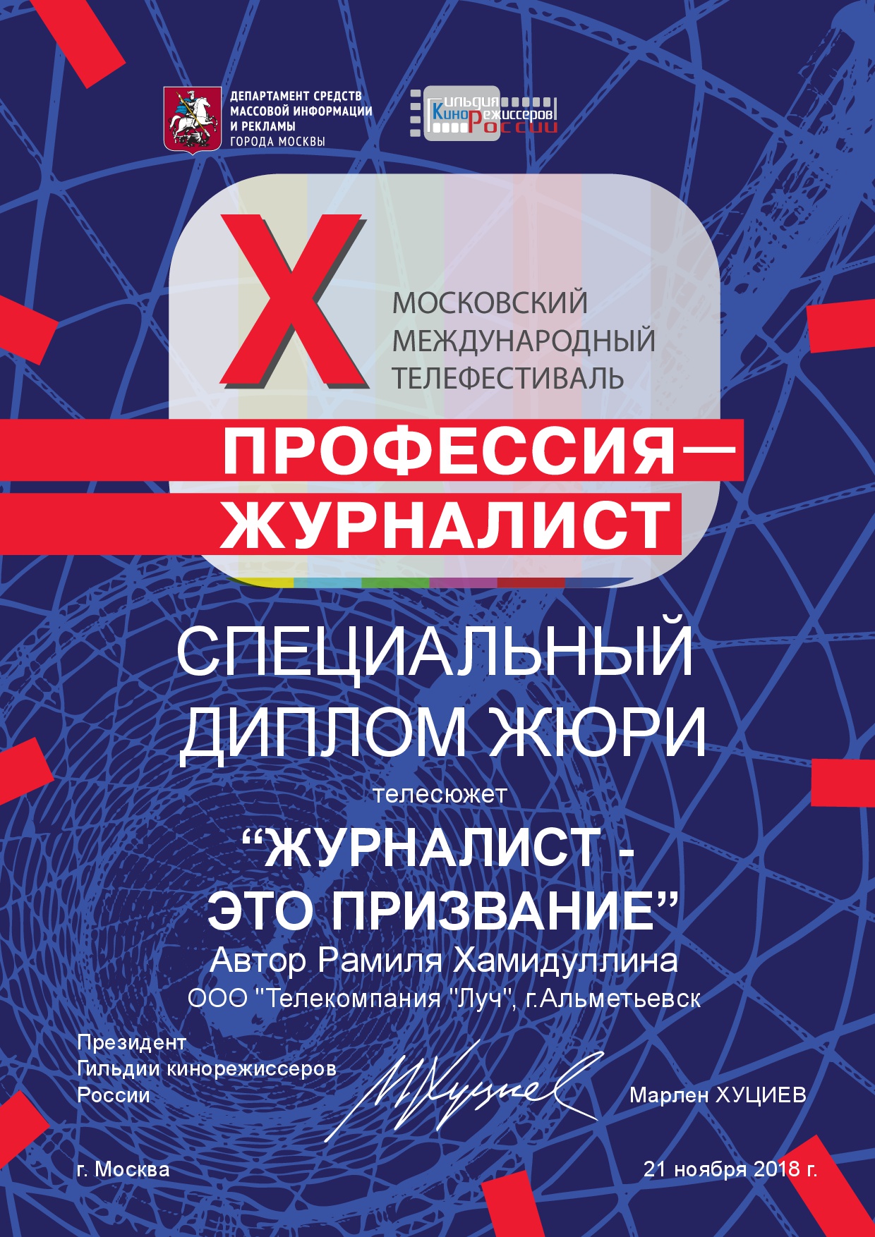 Специальный диплом жюри X Московского международного телефестиваля «Профессия-журналист» автору телесюжета «Журналист-это призвание» Рамиле Хамидуллиной ООО «Телекомпания «Луч» г. Альметьевск. (2018)