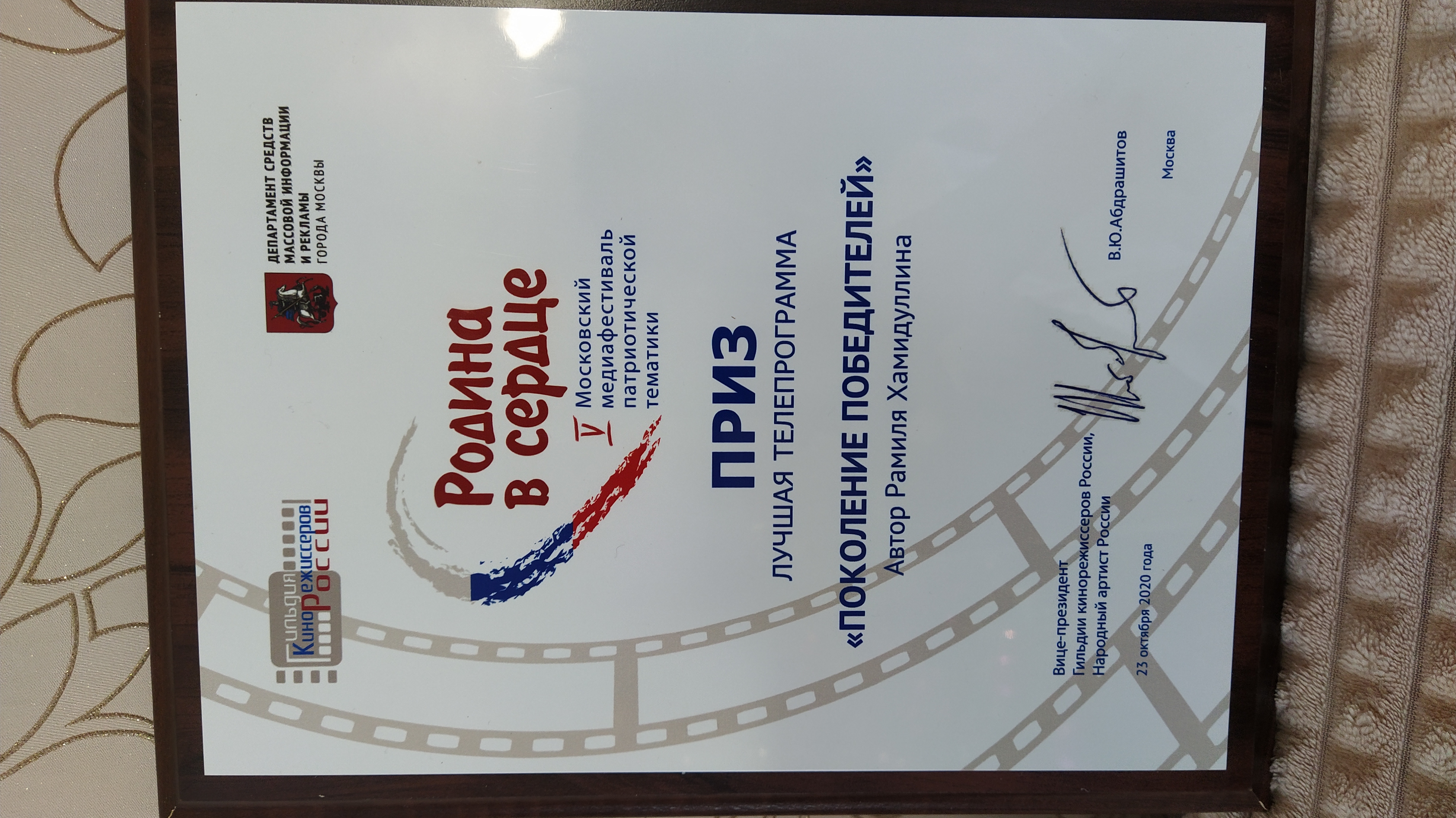 Главный приз всероссийского кинофестиваля «Родина в сердце» за проект «Поколение победителей» по решению гильдии кинорежиссеров России. (2020 г)